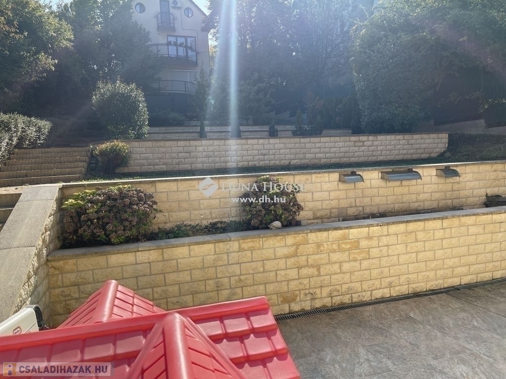 A kertrész teraszos megoldású, a telek 976 m2.