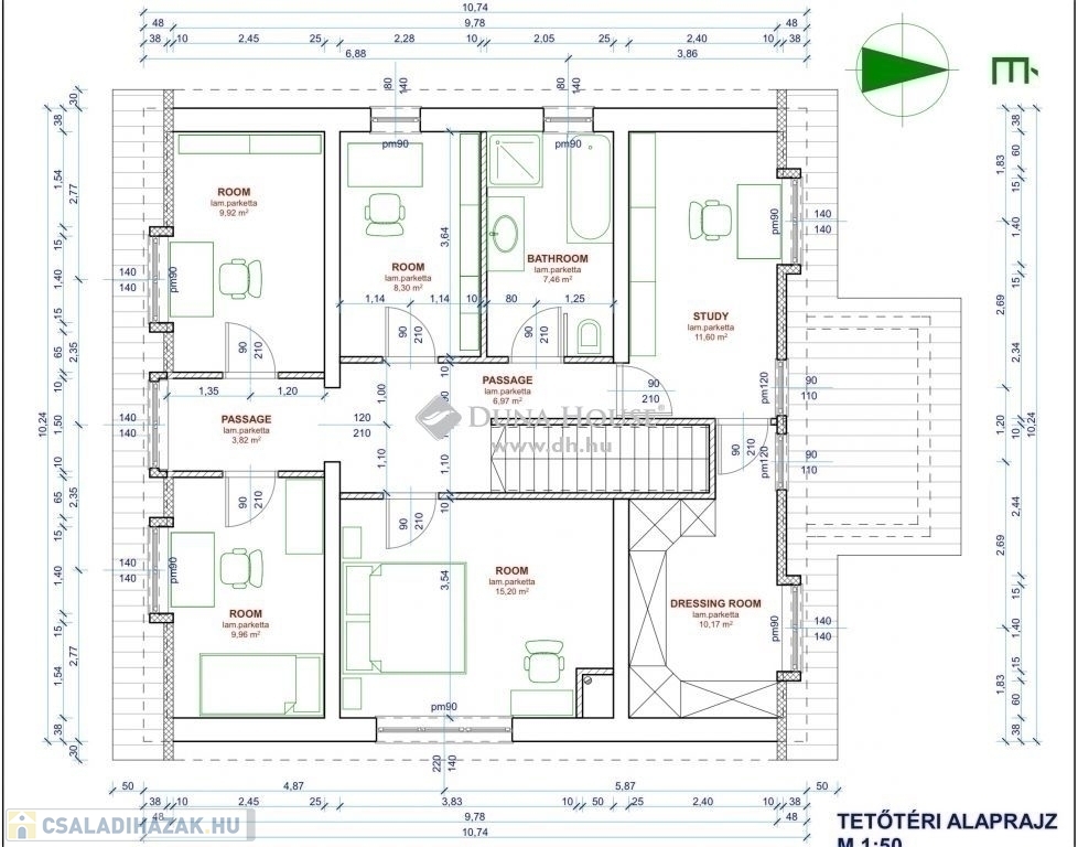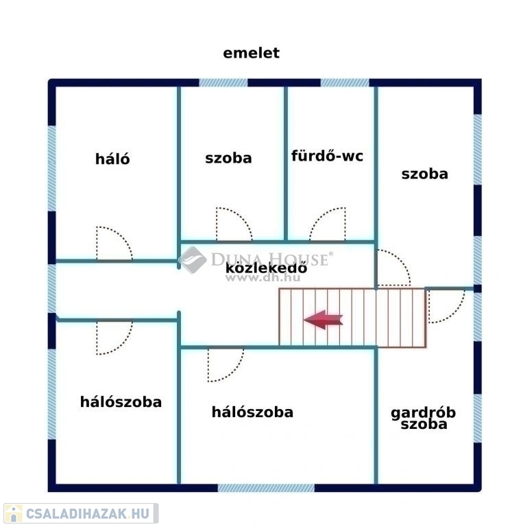 Az emeleten, ami br. 110 m2, 5 hálószoba, gardrób szoba és egy fürdő lett kialakítva.