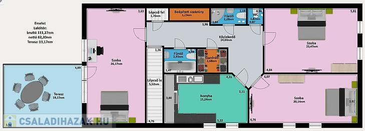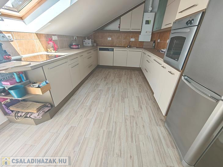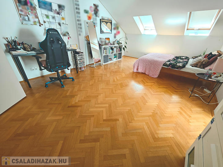 • Emelet: 3 szoba, 1 konyha, 1 gardrób, 2 fürdőszoba, 1 külön wc található. A nagy szobából nyílik egy 19,17nm-es terasz, amely hátsó kertre néz