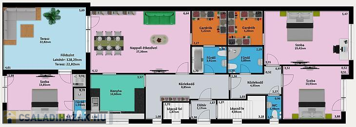 • Földszint: nappali, 2 szoba, 2 gardrób, 1 konyha, 2 fürdőszoba, 1 külön wc található. A nappaliból nyílik egy 22,82nm-es terasz közvetlen kertkapcsolattal. A teraszról nyílik egy külön mini garzon.
