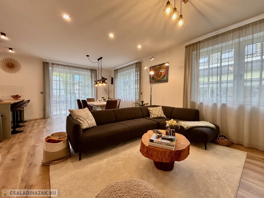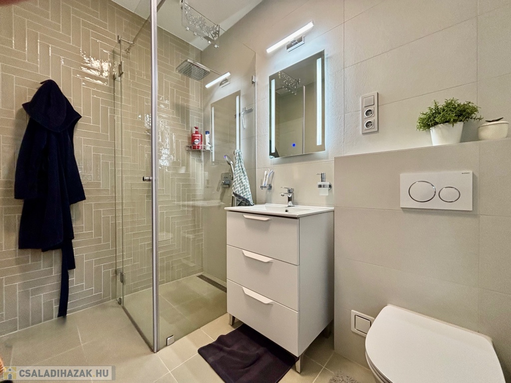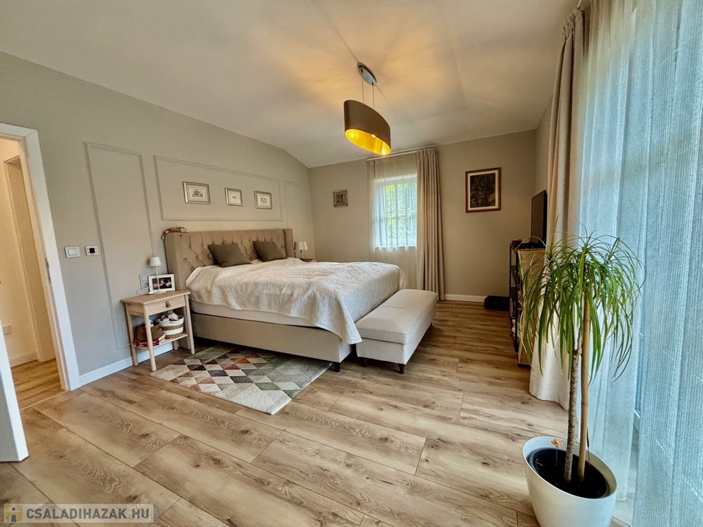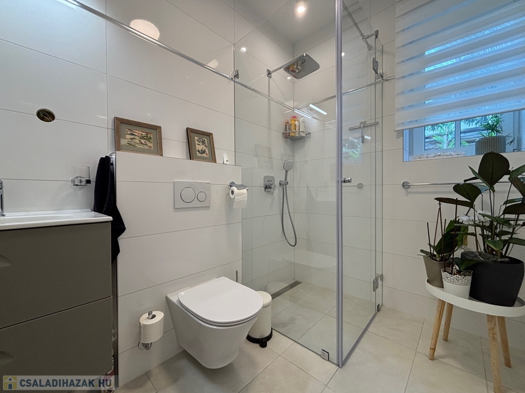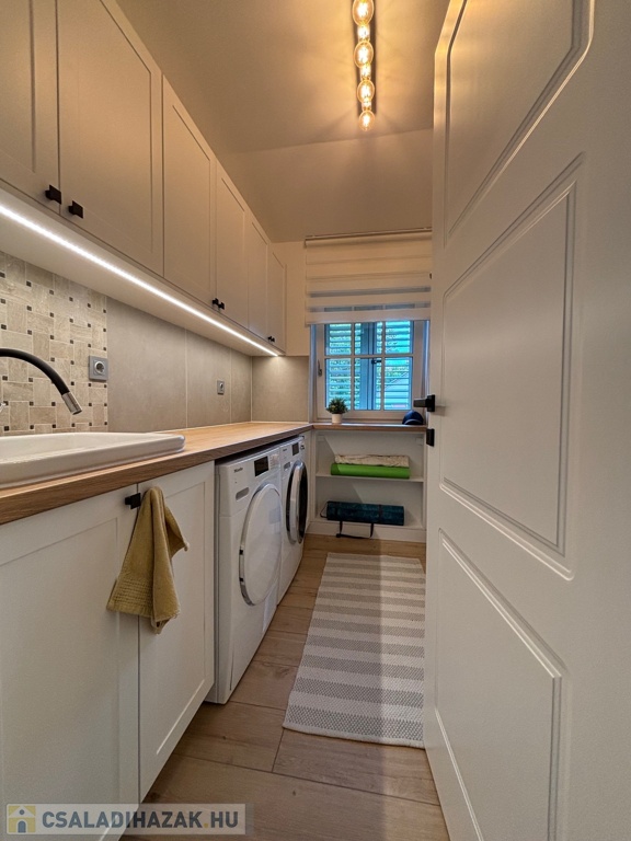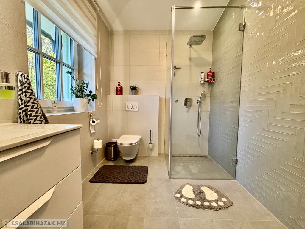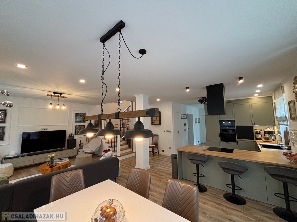 Kivételes lehetőség a II. kerület egyik legkeresettebb részén! Eladó egy frissen elkészült, amerikai stílusú luxusvilla, amely modern eleganciájával és kimagasló műszaki tartalmával valódi ritkaság a piacon. Főbb jellemzők: Nettó alapterület: 205 m² Terasz: 50 m² + minden szobához 4–6 m² erkély Telek mérete: 800 m², parkosított kert Elrendezés: kétszintes, átgondolt alaprajz, tágas terek ✨ Belső kialakítás: A földszinten elegáns előtér, világos, amerikai stílusú konyha–étkező–nappali egy légtérben, mely a családi élet központja. Ezen a szinten található egy vendégszoba saját fürdővel és WC-vel, kamra, tároló és gépészeti helyiség. Az emeletre vezető impozáns lépcső egy három hálószobás részhez érkezik, mindegyik saját fürdőszobával és erkéllyel. Két hálószobához külön gardrób, valamint mosókonyha és közlekedő is tartozik. ⚙️ Felszereltség és technológia: Daikin hőszivattyú (H-tarifa) Távvezérelhető padló- és mennyezetfűtés/-hűtés, helyiségenként szabályozható Riasztó, IP kamerarendszer Központi porszívó, vízlágyító Robotfűnyíró, automata öntözőrendszer Külső tér és extrák: A gondosan parkosított kert nyugalmat és intimitást biztosít. Kétállásos fedett gépkocsibeálló elektromos kapuval és autótöltő előkészítéssel Kültéri műhely / motortároló Dél–nyugati fekvésű, tágas terasz – tökéletes pihenésre és vendégfogadásra Ez az ingatlan a modern luxus, a kényelem és a zöldövezeti élet tökéletes harmóniáját kínálja. Tökéletes választás azoknak, akik prémium minőségű, új építésű otthont keresnek Budapest egyik legnyugodtabb, mégis központi részén.
