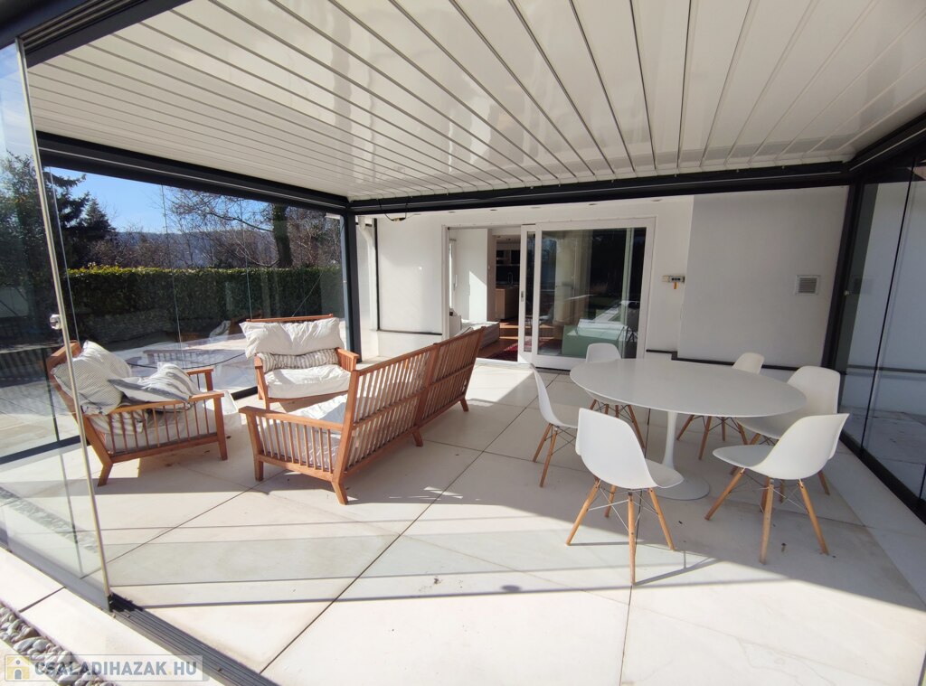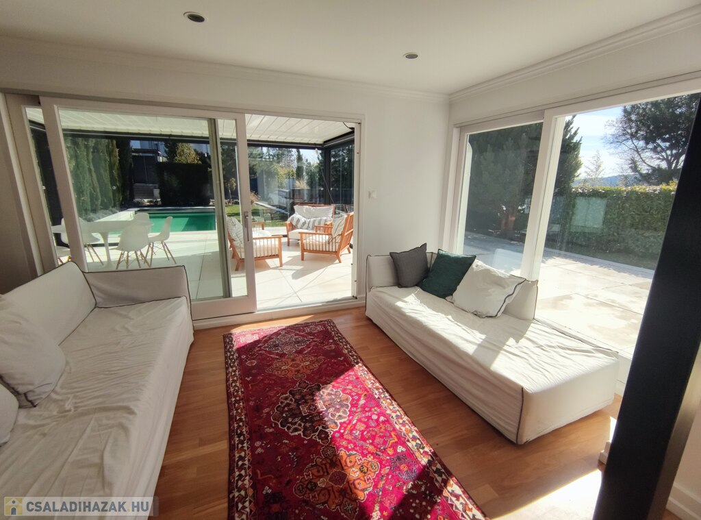The 3-storey, beautiful house, built in the early 2000s on a quiet, intimate plot, faces southeast. In 2019, during the renovation, a spacious, glazed covered terrace/winter garden was added, a heated pool was installed, and the sanitary facilities and built-in wardrobes were replaced.