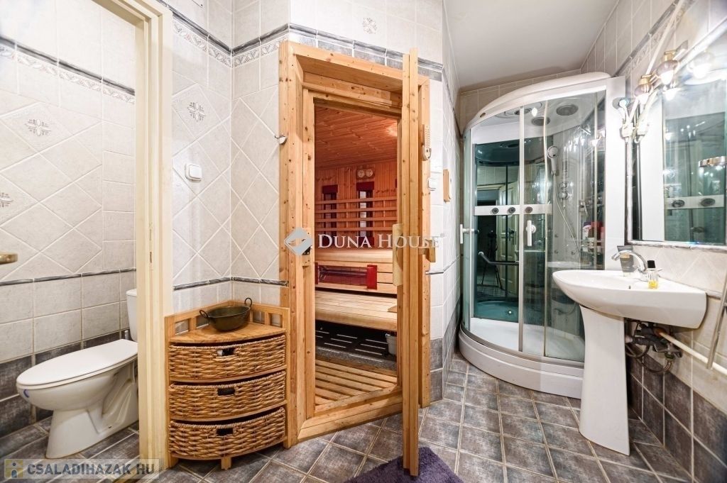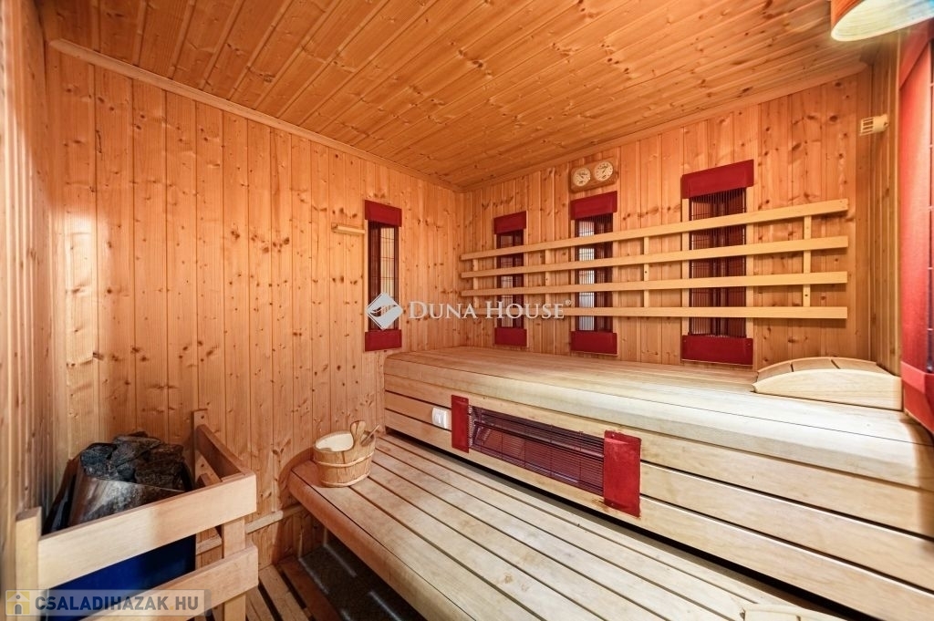 Az alsó szint valódi különlegesség: wellness részleg fin- és infraszaunával, zene szoba, mosókonyha, valamint további kiszolgáló helyiségek szolgálják a kényelmet és a kikapcsolódást. A három szinten végig gondosan megtervezett tárolók és gardróbok diszkréten simulnak bele az enteriőrbe.