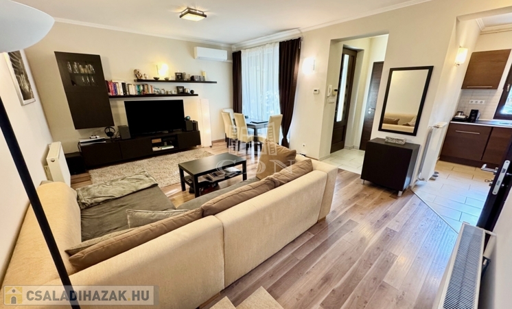 III. kerületben, Csillaghegyen, kertvárosi környezetben, kiváló közlekedés és ellátottság mellett, CSENDES aszfaltozott mellékutcában, 2011-ben épült, 4 lakásból álló sorházban, saját tulajdonú 102 nm-es intim kerttel, valamint dupla terasszal rendelkező (8+5 nm), 2 szintes, 70 nm-es lakóterületű, kiváló elosztású, nappali + 2 hálószobás, ablakos konyhás, kamrás, dupla wc-s, napos-világos D-NY-i fekvésű, alacsony fenntartású, kombinált gázcirkó fűtésű, egyedi mérésű, újszerű állapotú, klimatizált, riasztórendszerrel felszerelt, tehermentes, rugalmasan birtokba vehető, önálló helyrajzi számmal rendelkező sorházi lakás, beépített, gépesített konyhával, fedett felszíni gépkocsibeállóval, 6 nm-es kerti tárolóval, gondozott kerttel, kulturált lakóközösségű társasházban eladó.