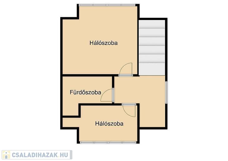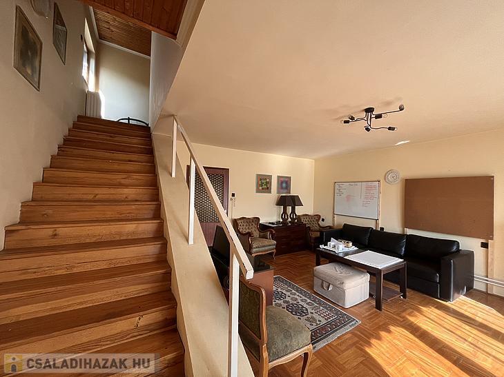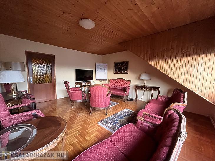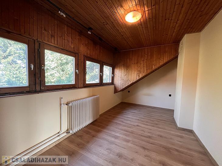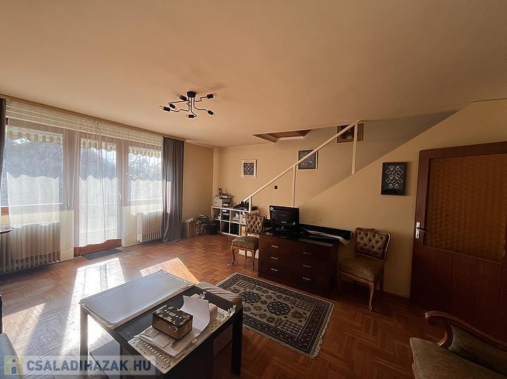 Az ingatlan az 1987-ben épült, jelenlegi elosztása 3 szobából, konyhából és 2 fürdőszobából áll. Ebből az alsó szinten 1 szoba, konyha és fürdőszoba található, míg az emeleten a másik 2 szoba és egy fürdőszoba található, illetve feljáró a padlástérbe.