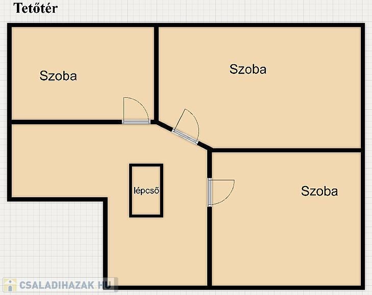 A tetőtérben három különnyíló szoba kapott helyet, a fűtés itt is kialakításra került, a padlóburkolat fa parketta.