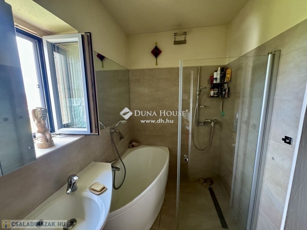 Egyebek: Az utcai bejáratnál egy fedett gépkocsi beálló található, azonban az utcafront másik végén egy másik autó számára is kialakítható egy beálló. A ház alatt 2 pince (14 m2 és 10 m2) is található, a nagyobban a kazán, egy wc és egy kézmosó is helyet kapott. Éjszakai áram is elérhető az ingatlanban, valamint a vízórán kívül 2 db mellékvízmérő locsoláshoz. Az ingatlan dupla rezsitámogatásra alkalmas. A tetőszerkezet jó állapotú, azonban a héjazat cserélendő.