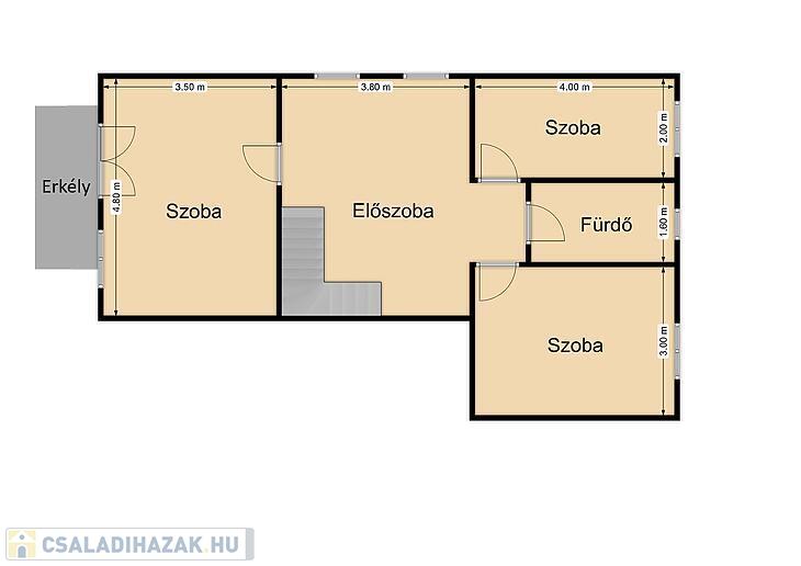 A ház alsó szintjén található az előszoba, konyha, étkező, egy fürdő és a nappali, ahonnan a terasz nyílik. Az emeleten 3 szoba, egy fürdő és egy erkély található.