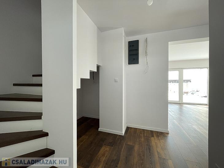 Az elülső 96 m²-es ház jelenlegi elosztása az alsó szinten egy amerikai konyhás nappaliból, egy szobából és fürdőből, a felső szinten pedig 2 és 1 félszobából, valamint egy fürdőből áll.