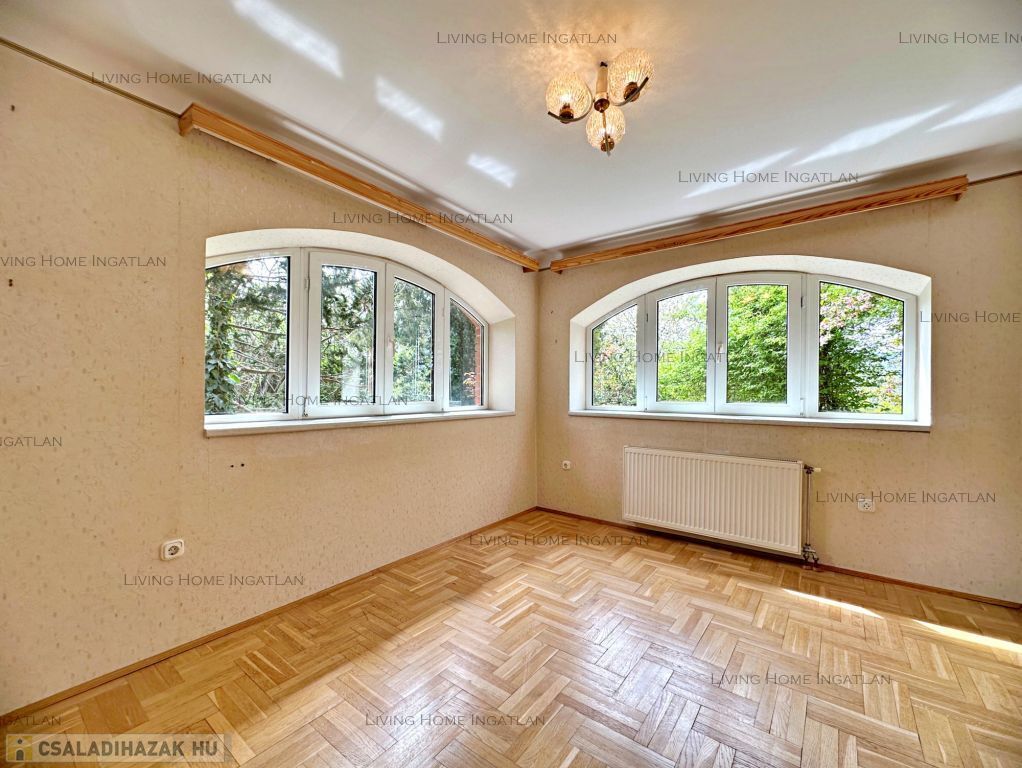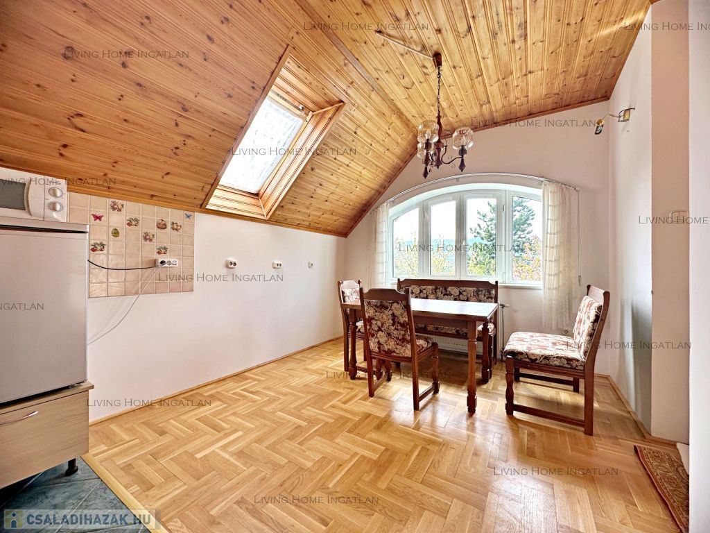 Eladó a III. kerület egyik legkedveltebb, zöldövezeti részén egy kiváló adottságokkal rendelkező, panorámás családi ház nagy telken. Az ingatlan zsákutcában helyezkedik el, új építésű ingatlanok környezetében. Csendes, nyugodt környezet, könnyen megközelíthető lokáció. A délnyugati tájolásnak és a nagy ablakoknak köszönhetően a terek, a szobák világosak. Az ingatlan egyik különlegessége a parkosított kert gyümölcsfákkal, konyhakerttel, dísznövényekkel, virágokkal. Pihenésre, feltöltődésre, kertészkedésre kiválóan alkalmas. A telek hátsó részében egy kisház és egy üvegház is található.