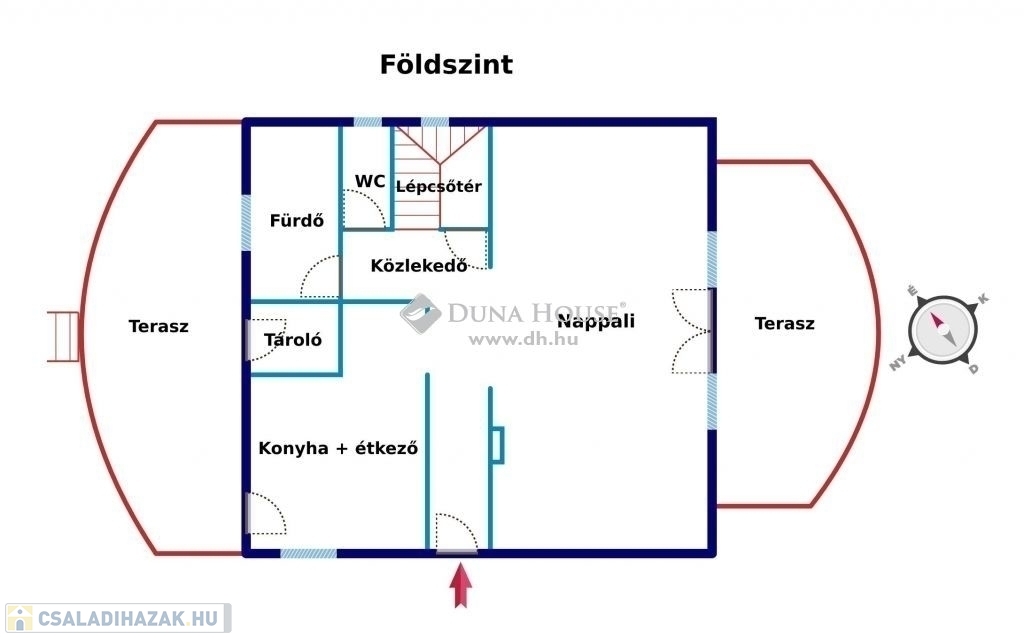 A ház középpontja a rendkívül tágas, 44 nm-es nappali, amihez egy 22 nm-es terasz kapcsolódik. Szintén a földszinten található külön helyiségben a konyha, ami méretének köszönhetően az étkezőt is magában foglalja. Ugyanitt tágas, nagy ablakos fürdőszoba zuhanyfülkével található, a wc külön helyiségben van.