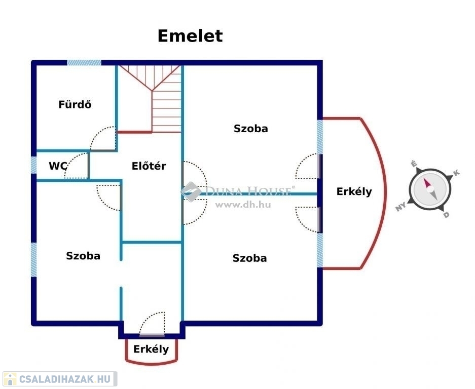 Kényelmes magasságú, széles lépcsőn juthatunk fel az emeleti közlekedőbe, innen léphetünk be mindhárom hálószobába, amelyekhez erkély is tartozik. Továbbá itt az emeleti fürdőszobában kényelmes méretű kád található, wc szintén külön helyiségben.