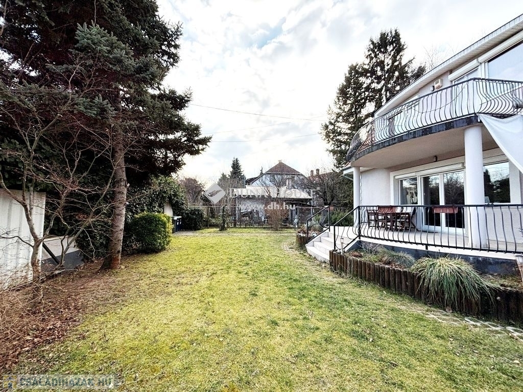 A füvesített, automata öntözőrendszerrel kiépített udvar bokrokkal, örökzöldekkel és egy fenyővel tarkított kellemes hangulatú hely, ahova a széles 22 nm-es földszinti terasz, illetve az emeleten található 14 nm-es erkély nyílik.