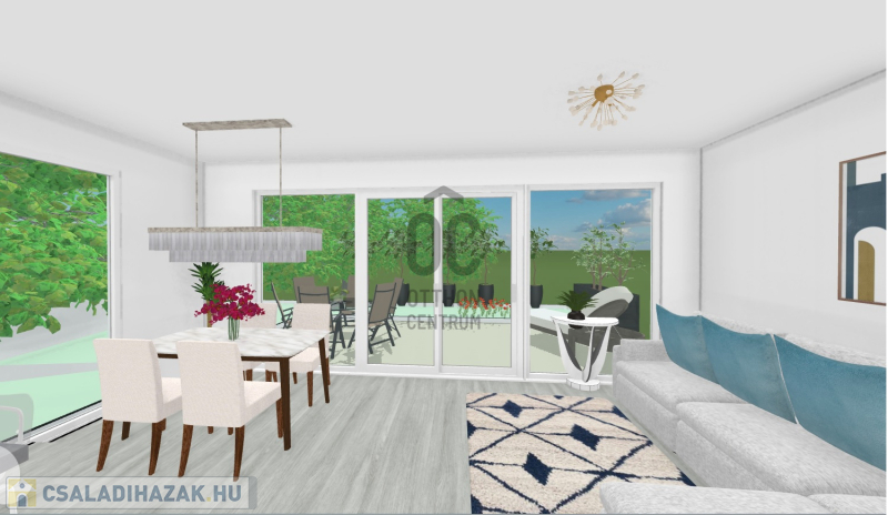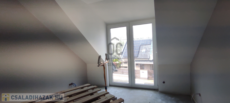 Nagy nyílászáróinak és a D-K-i tájolásának köszönhetően roppant világos. Az emeleti hálószobákon is teraszajtók vannak franciaerkélyes megoldással.