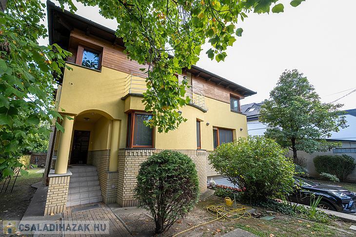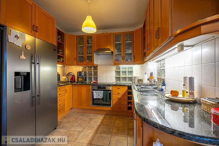 A 1998-ban épült, masszív, 38 cm-es Porotherm téglából készült épületet az eredeti építtető és tervező gondos odafigyeléssel tájolta, a belső tereket pedig funkcionálisan és esztétikusan alakította ki. A ház egyik különleges eleme a szinteltolásos, körcikk alakú nappali, amely galériás kialakításával, kandallójával és nagy belmagasságával lenyűgöző központi teret biztosít – ez a ház valódi szíve.