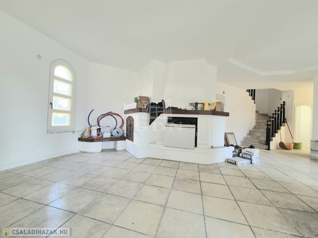 A földszinten az ablakos-világos konyhát, egy méretes, benapozott, teraszkapcsolatos, kandallóval rendelkező nappalit, hálószobát, zuhanyzós fürdőszobát találunk.