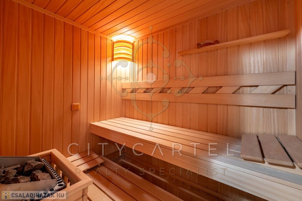 Alsó szint: klubhelyiség kandallóval, wellness-részleg (finn szauna, szolárium, zuhanyzó), kondihelyiség/télikert, társalgó/vendégszoba, tárolók, mosókonyha, gépészeti helyiség, 48 nm-es kétállásos garázs, 17 nm-es tárolóval, műhellyel – egybenyitásával további 1-2 személygépkocsinak garázshely megoldható