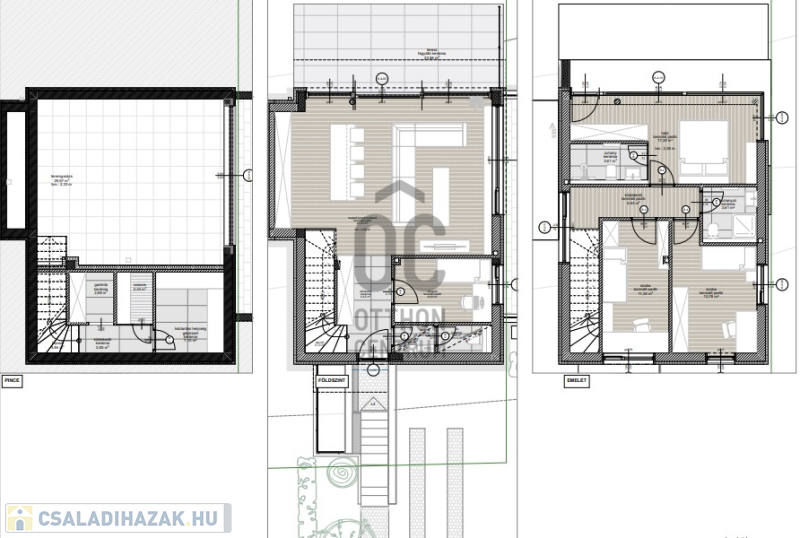 Sajátossága, hogy belső három szintes, ahol a pinceszinten a dupla állásos garázs mellett található a háztartási helyiség, tároló, szauna.
