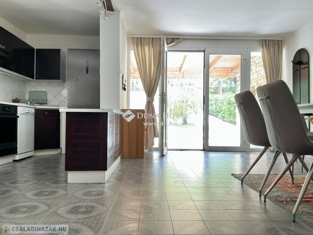 A földszinten a kertből a nagy méretű teraszon keresztül belépünk a fényárban úszó étkező-konyhába. A közlekedőből balra ismét egy zuhanyzós WC, balra a lépcsőház található. A közlekedőből tovább haladva, egy világos, szép nappaliba lépünk, ahonnan az előszoba és a bejárti ajtó található.