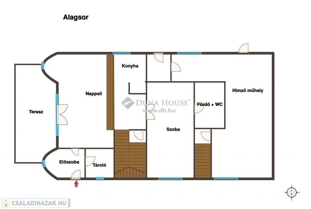 Az alagsorba belső lépcsőházon keresztül jutunk egy U alakú hímzőműhely (55.9 nm) félszuterén szintre. A ház oldalsó bejáratán keresztül egy teraszkapcsolatos lakásba lépünk. Az előszobából a világos, nagy méretű konyha-nappaliba - teraszkapcsolattal - jutunk, amelyből egy háló és egy zuhanyzós fürdőszoba nyílik.