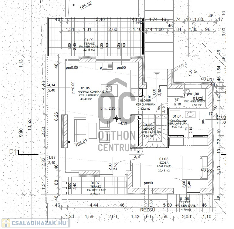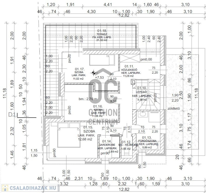 A házhoz tartozik 55 nm burkolt terasz, valamint 27 nm zöldtetős terasz.