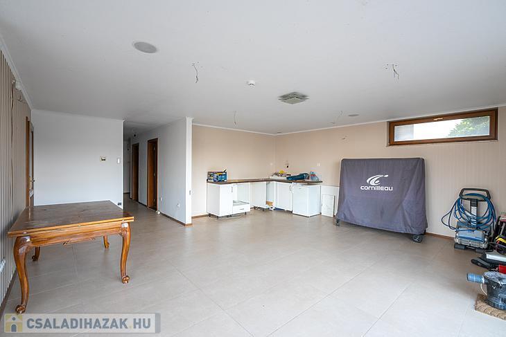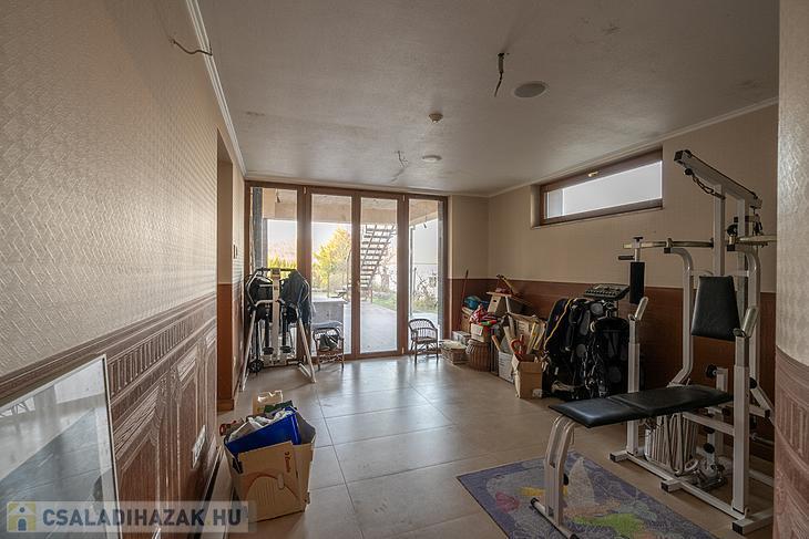 Az alsó szinten van egy amerikai konyhás nappali, 1 szoba (ez jelenleg zuhanyzóval ellátott fitness teremként szolgál), borospince, a kiszolgáló helyiségek (gépház, mosókonyha, tárolók), valamint egy nagy kertkapcsolatos terasz épített nyári konyhával, amely kemencével és grill sarokkal felszerelt, továbbá itt kapott helyet egy Infrativ infraszauna.