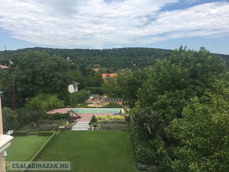 A telken található egy 10x4 méteres feszített víztükrű, ellenáramoltatós, extra panorámás medence, automata öntözőrendszerrel és automata fűnyíró robottal felszerelt, parkosított kert emelt ágyásos veteményessel (szőlő, málna, szeder, füge, birs...).