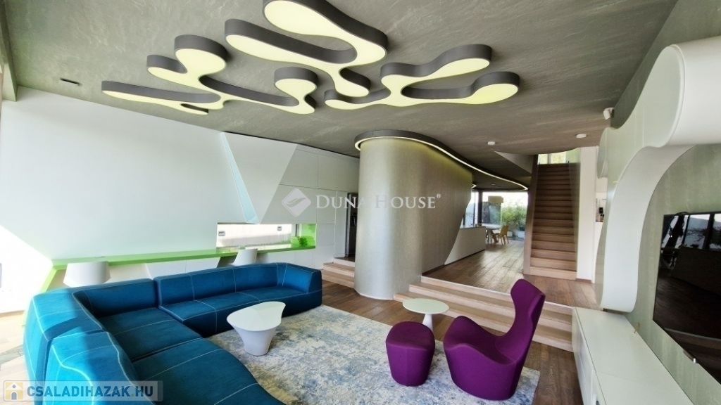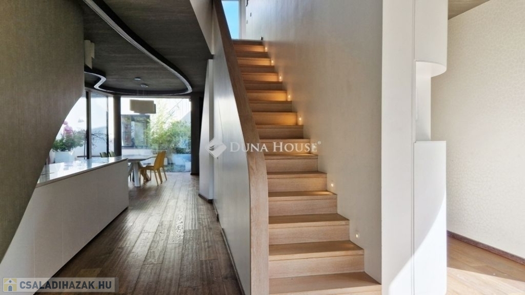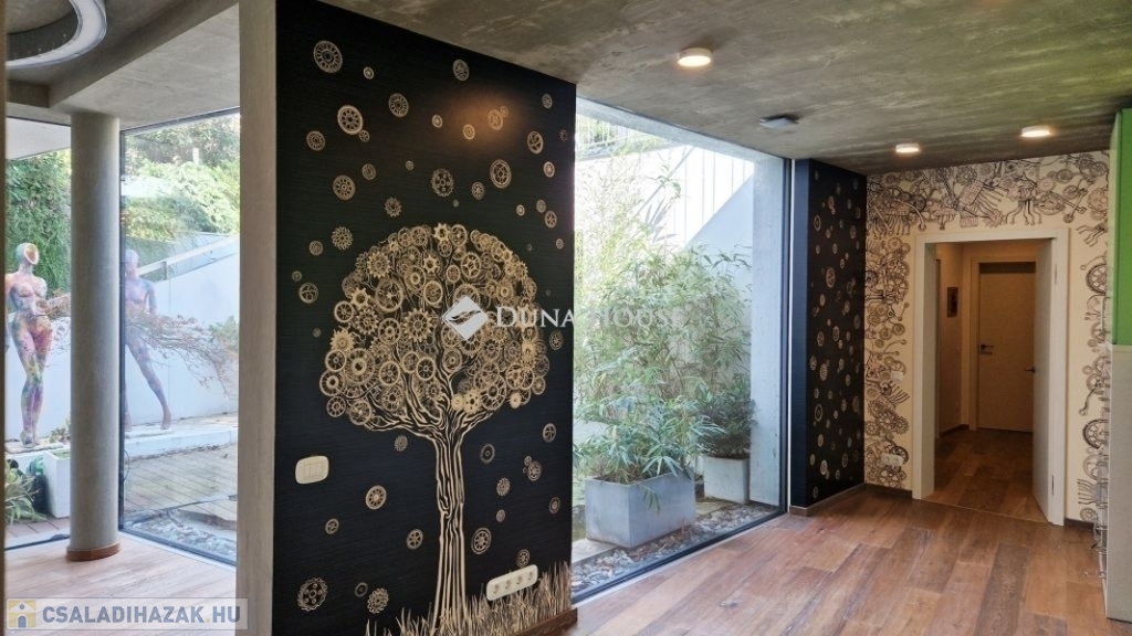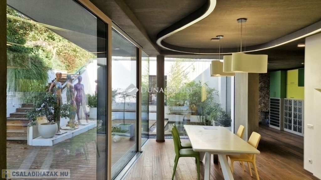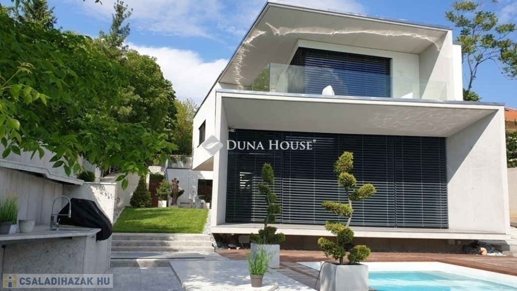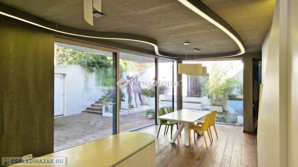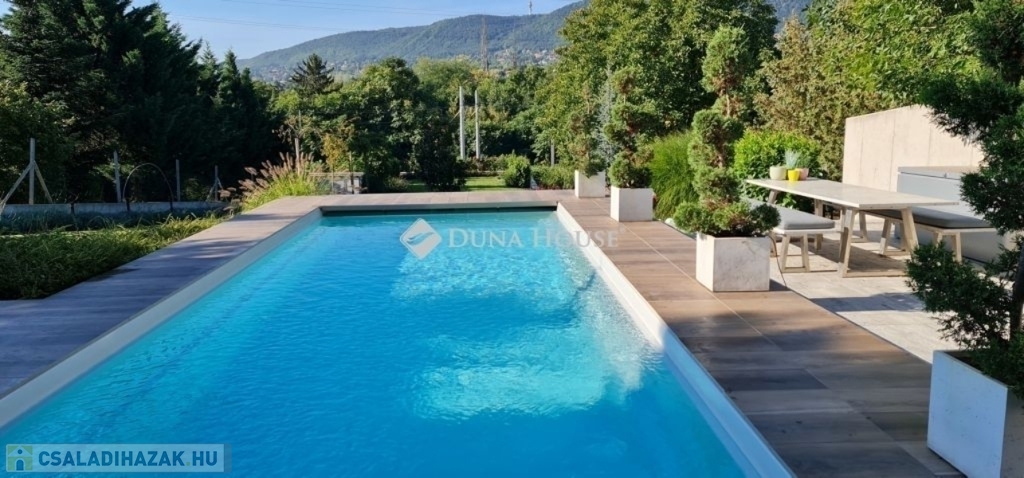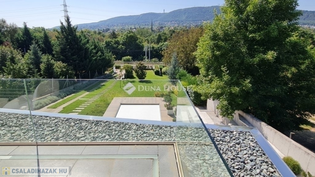 A földszinti 40 m2-es napsütötte, déli tájolású nappaliból tudunk kilépni a medencés teraszra. Az öntözőrendszerrel felszerelt, gyönyörűen parkosított kert igazi megnyugvást ad egy sűrű nap után. A házhoz tartozik kerti konyha, jacuzzi és saját fitness terem is.