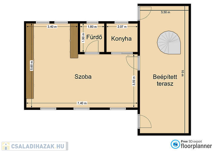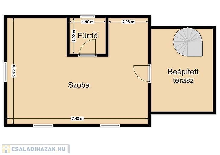 Jelenlegi elosztása a földszinten konyhából, kádas fürdőszobából és egy tágas térből áll, ahol egy térelválasztó könyvespolc és egy egyedi beépített tükrös gardróbszekrény található. A külön bejáratú emelet egy szobából és fürdőből áll, amely még befejezésre vár.
