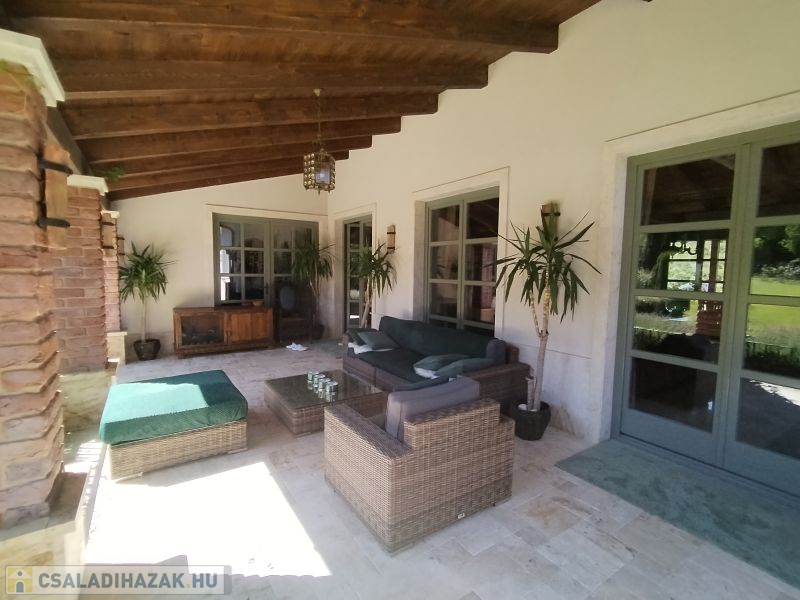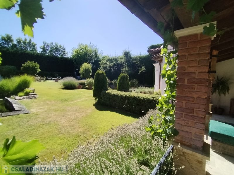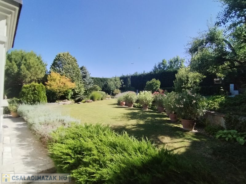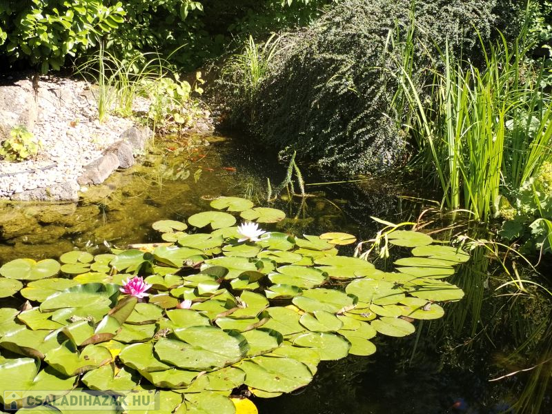 A házat körülölelő álomszép kertben kis pihenők, tavirózsás halastó, gyönyörű növényzet, mely nemcsak szemet gyönyörködtető, de maximális intimitást is biztosít az itt lakóknak.