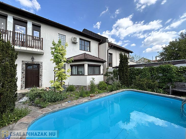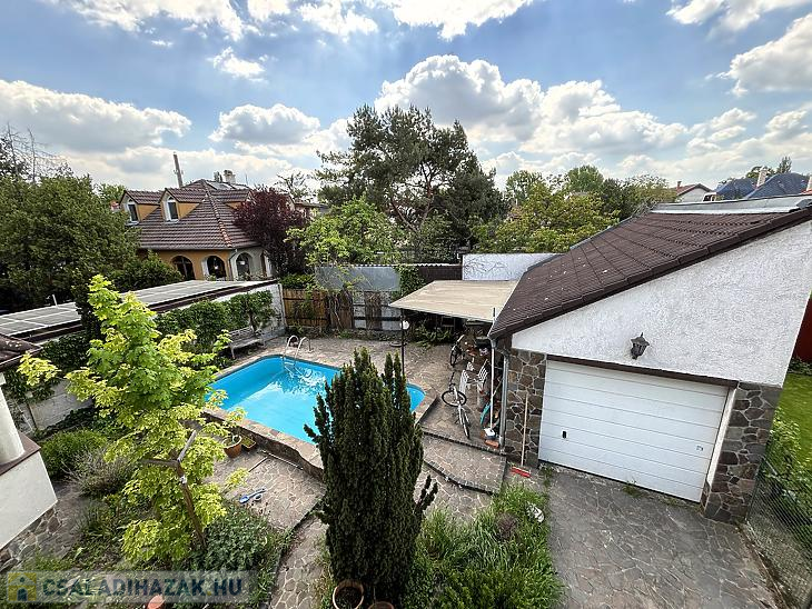 IV. kerületben, Újpest-kertváros részen, 347nm-es telken, bruttó 110nm-es, nettó: 94nm-es, előkertes, három fekvésű (É/D/Ny), duplakomfortos, 3 szobás, földszinti házrész eladó, 35nm-es pincével, saját 200nm-es medencés kerttel, autóbeállóval, garázzsal.
