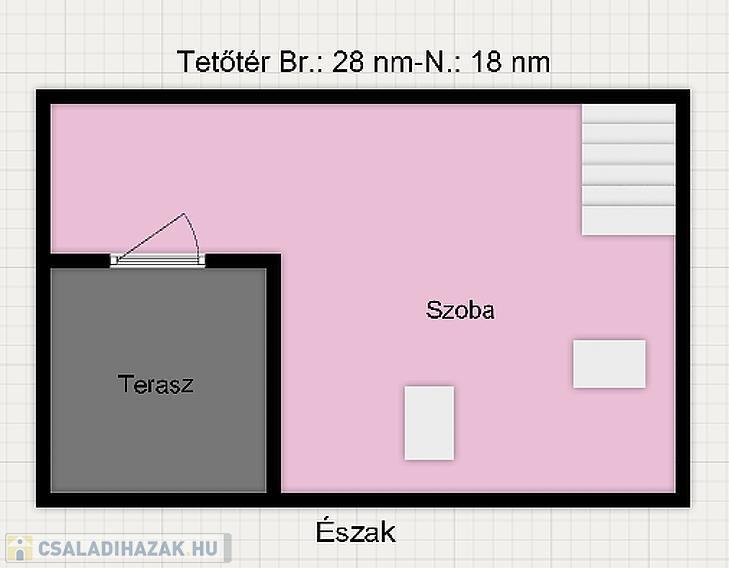 A tetőtérből egy kb. 5 nm-es teraszkapcsolat nyílik.