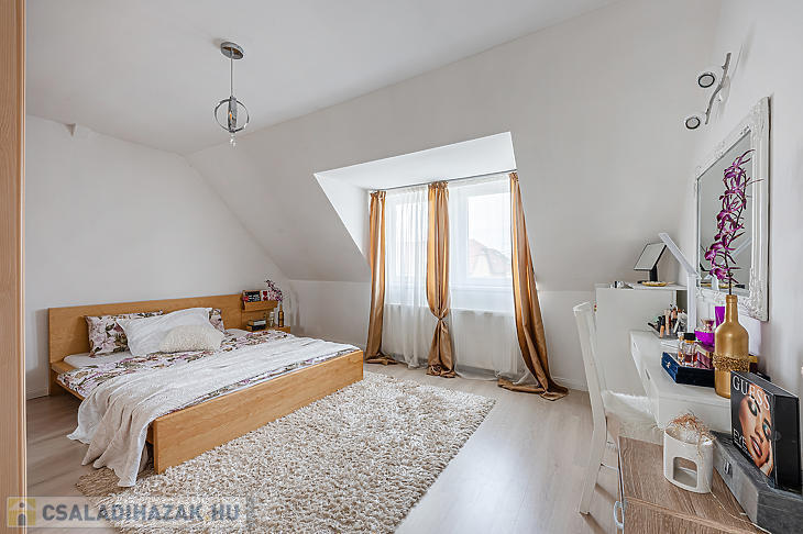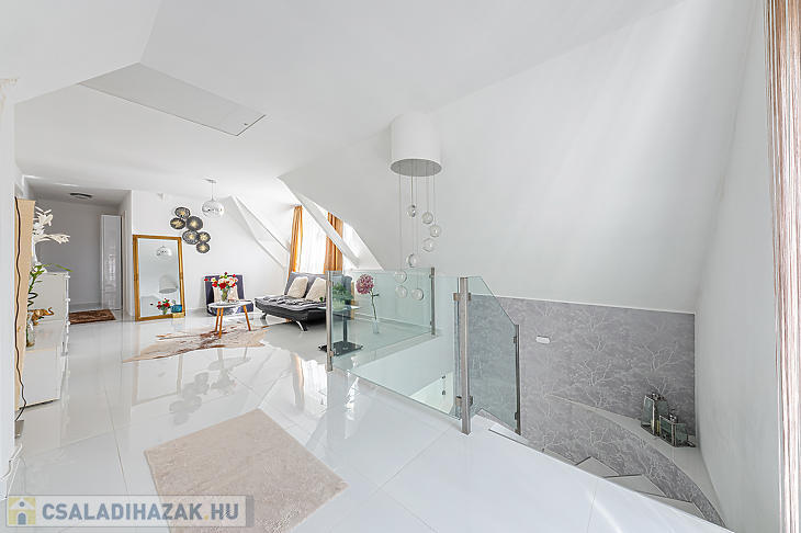 Az ingatlan elosztása kiváló, az alsó részen egy hatalmas nappali található, konyhával és étkezővel, a felső szinten pedig két szoba és egy tágas fürdőszoba lett kialakítva.