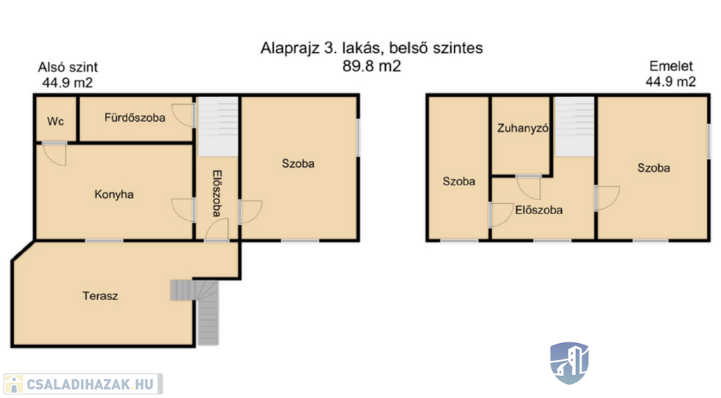 - A felső szint 2 szobából, egy fürdőszobából és egy előtérből áll.