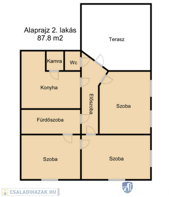 - 3 szobából, egy étkezős konyhából, Wc-ből, fürdőszobából és egy előszobából áll.