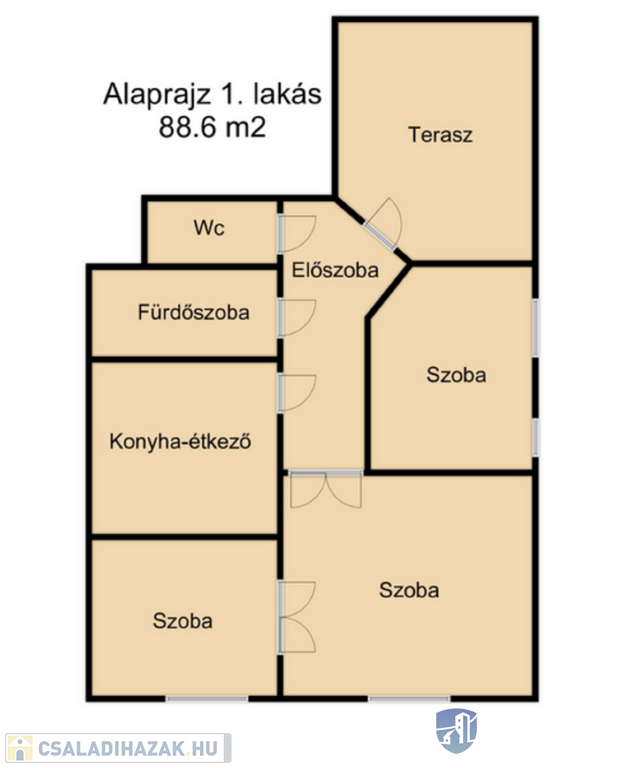 - 3 szobából, egy étkezős konyhából, 2 külön Wc-ből, egy fürdőszobából és egy előszobából áll.