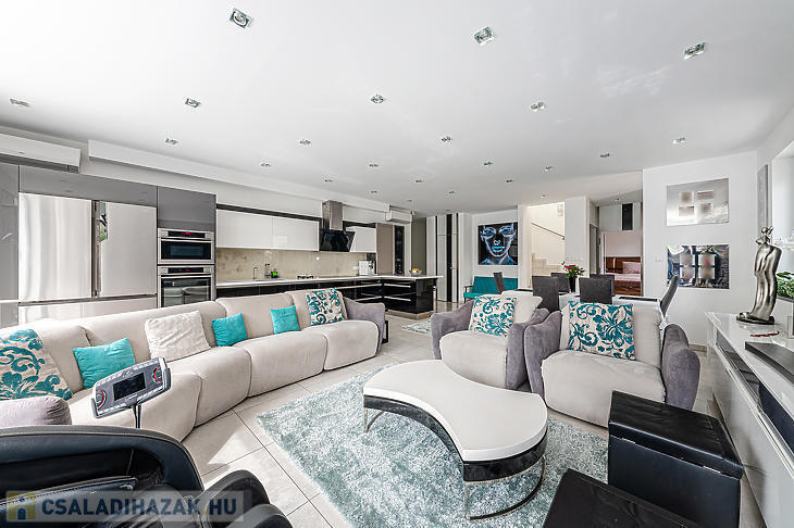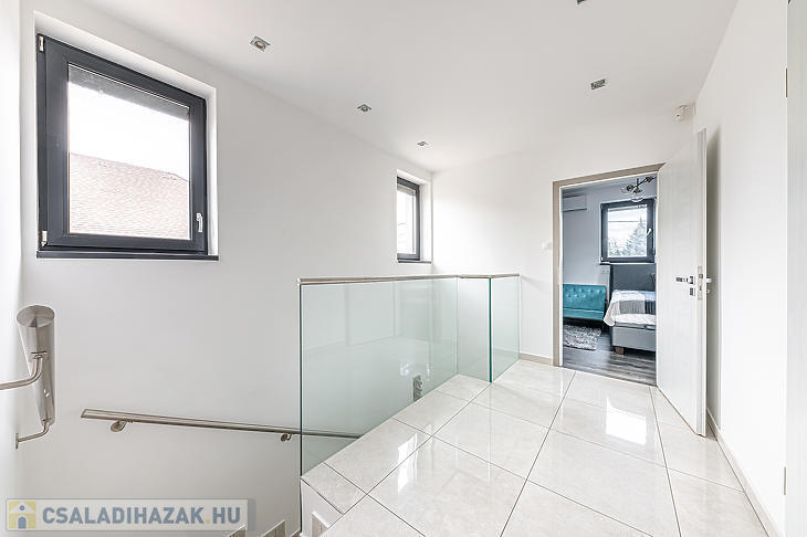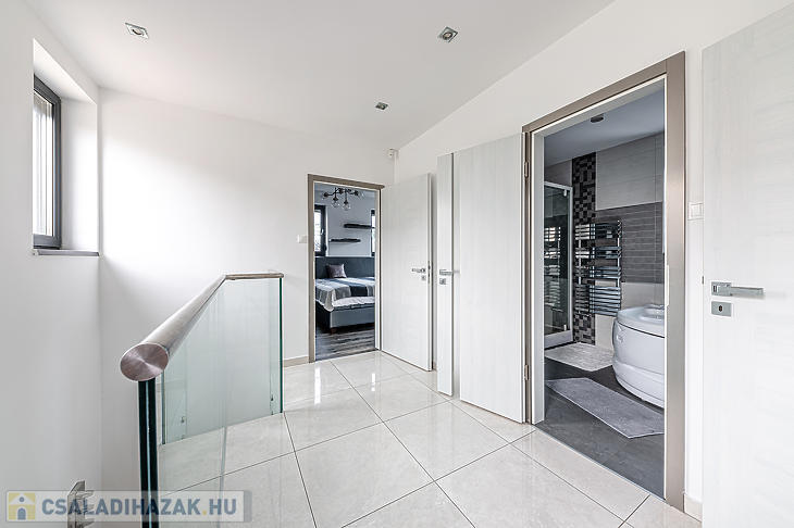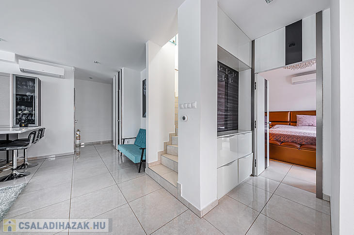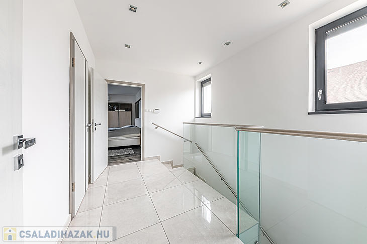 A földszinten, a bejárati ajtón belépve egy rendkívül tágas amerikai konyhás nappaliban találjuk magunkat – ez a ház központi része, ahonnan bármelyik helyiségbe kényelmesen eljutunk. Itt található a szülői háló, amelyhez privát fürdőszoba és gardróbhelyiség tartozik, továbbá egy dolgozószoba, mosókonyha, tárolóhelyiségek, vendégmosdó és közvetlen megközelíthetőség a garázshoz is. A földszinti helyiségek java részéből a kert közvetlenül elérhető. A felső szinten kettő hálószoba és egy fürdőszoba található. Az egyik szoba 15 négyzetméteres terasszal rendelkezik.
