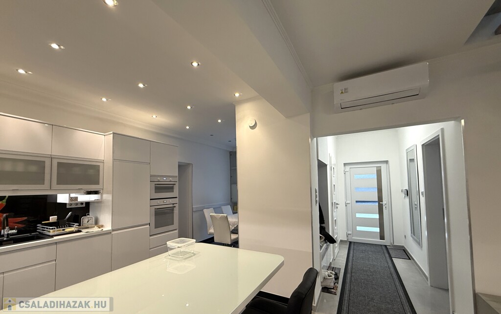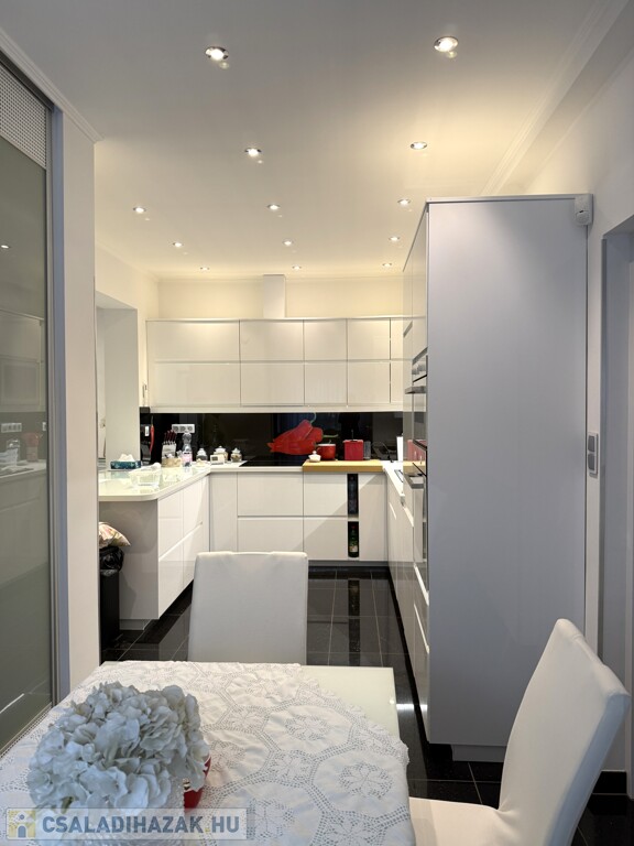 • a nappali térhez étkező pulttal csatlakozó elegáns nagy konyhatér nagyméretű beépített konyhabútorral és konyhagépekkel felszerelten, ablakos étkező térrel (17,4 nm) gardróbbal,