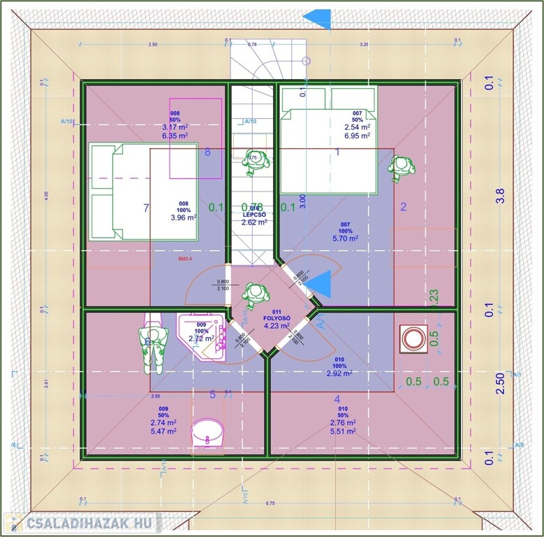 • központi közlekedőből nyíló 1 szoba (8,2 nm 1.90m feletti alapterülettel) plusz 2 félszoba (kb. 6-6 nm 1,90m feletti alapterülettel) tetőtéri ablakokkal, utóbbiak akár dolgozó szobaként,