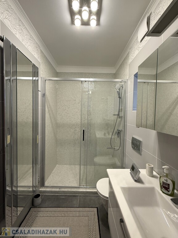 • elegáns természetes fénnyel megvilágított fürdőszoba zuhanyzóval és wc-vel, mosdó szekrényekkel,