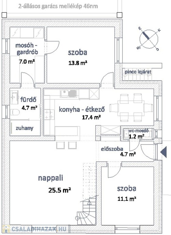 a lakóházhoz csatlakozó könnyűszerkezetes garázs melléképület (kb. 46nm)