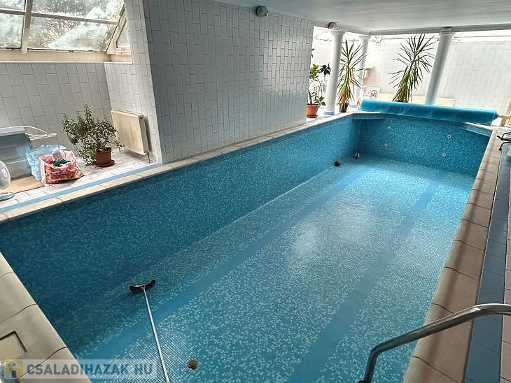 A pince szinten található egy beltéri, fűthető medence és egy dupla beállásos garázs. A garázs előtti autóbeálló kettő autó parkolására alkalmas. Illetve az utcán kialakításra került 4 db autóbálló hely.