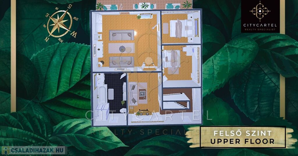 Felső szint: előtér/társalgó, 2 hálószoba, nappali, világos, ablakos fürdőszoba káddal, zuhanyzóval és WC-vel, terasz, padlásfeljáró