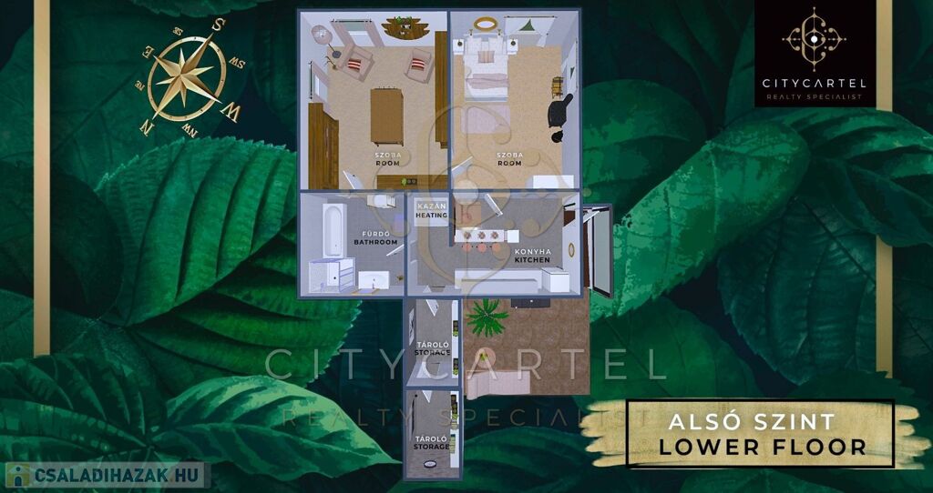 Alsó szint (külön lakás): konyha, étkező, szoba, fürdőszoba káddal és WC-vel, tároló, raktár, kazánház