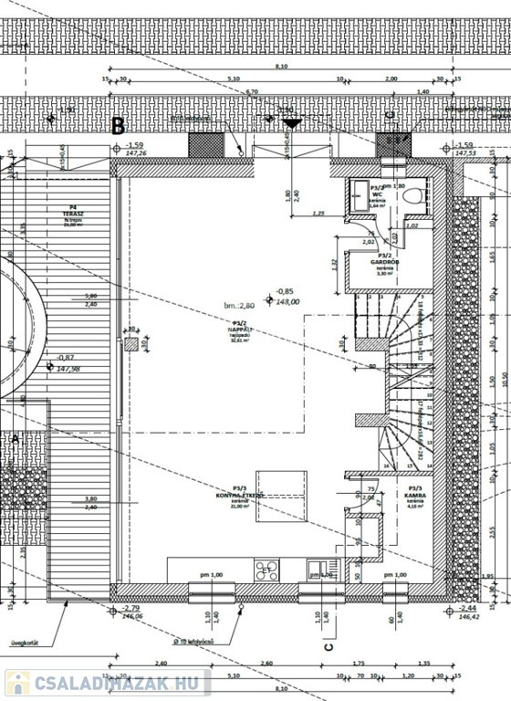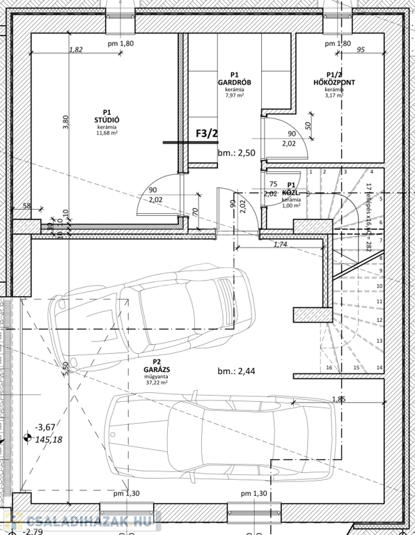 Az alsó szint kétállásos garázs, közlekedő, hangszigetelt dolgozó szoba, gépház tagozódású.