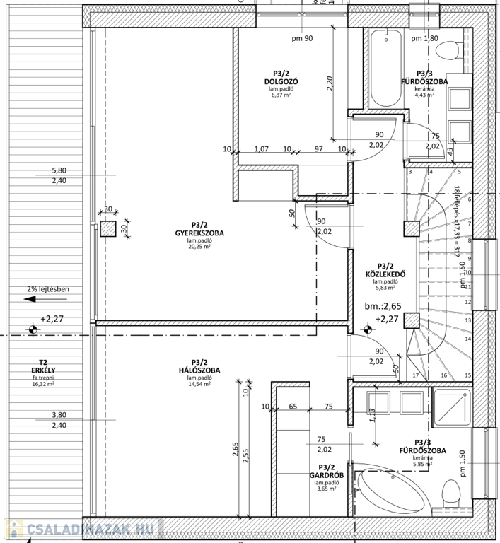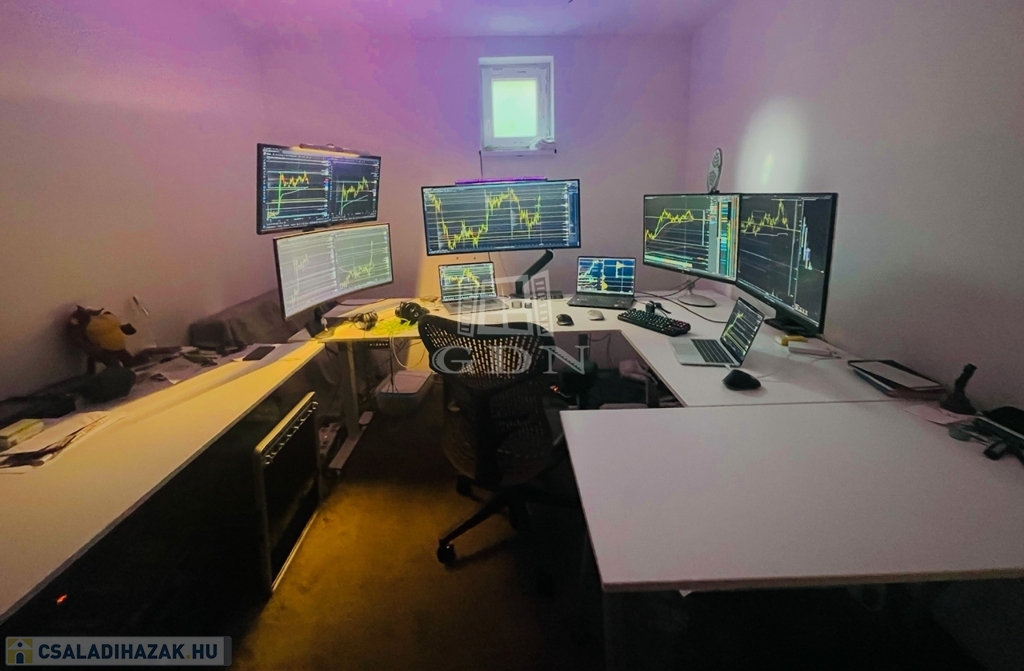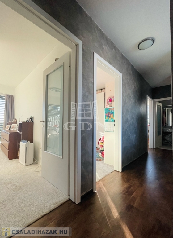 Az emelet hálószoba, gardróbszoba, gyermekszoba, dolgozó szoba és két fürdőszoba kiépítésű. A fürdőszobák kádas/zuhanyzós, illetve sarokkádas kialakításúak. A háló és gyermek szobából az épületen végig húzódó 16 m2 területű, panorámás teraszra léphetünk.