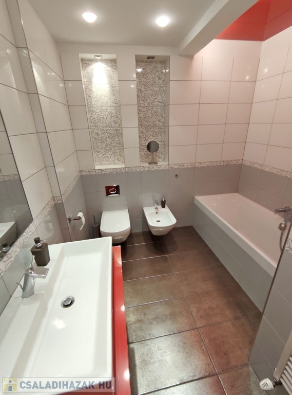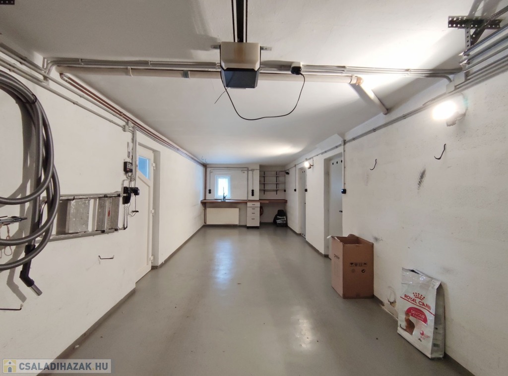 A családi házba a távirányítású elektromos kiskapun keresztül az előkerten áthaladva a több ponton záródó biztonsági bejárati ajtóhoz jutunk. A bejárati ajtóból balra nyílik a 34 nm garázs, ahol egymás mögé két személykocsival is be lehet parkolni. Innen balra nyílik egy 22,6 nm-es járólappal burkolt mosókonyha, ami mosógéppel felszerelt, itt található a gázkazán, ami az egész ház fűtéséről gondoskodik, továbbá a beépített házközponti porszívó rendszer is, ami biztosítja minden szinten a zajtalan pormentes takarítást. A garázs jobb oldalán nyílnak az 1,7 nm-es és 4,9 nm-es tárolók polcrendszerekkel. A garázsból jobbra kilépve a zárt lépcsőházból vezet fel a ház első szintjére. Belépve a bejárati ajtón a járólappal burkolt 7,6 nm-es előtér fogad minket, ahonnan jobbra a 10,6 nm-es ablakos, járólapos konyha nyílik, ami jelenleg nem bútorozott, ebből kifolyólag az új tulajdonos a saját ízlésére formálhatja. Innen kilépve az előtérben tovább haladva balra a fürdőszoba található, ami magában foglalja a toalettet is. Innen kilépve balra a 13 nm-es ablakos, fa parkettás hálószoba következik. Ezzel a szobával szemben nyílik a 24,13 nm-es, szintén fa parkettás, ablakos nappali szoba, ami a belső kertre néz. Ezen a szinten már a beépített házközponti porszívó rendszerrel lehet takarítani. A meleget radiátorok biztosítják, a felszerelt klíma nyáron kellemesebbé teszi a hőérzetet.