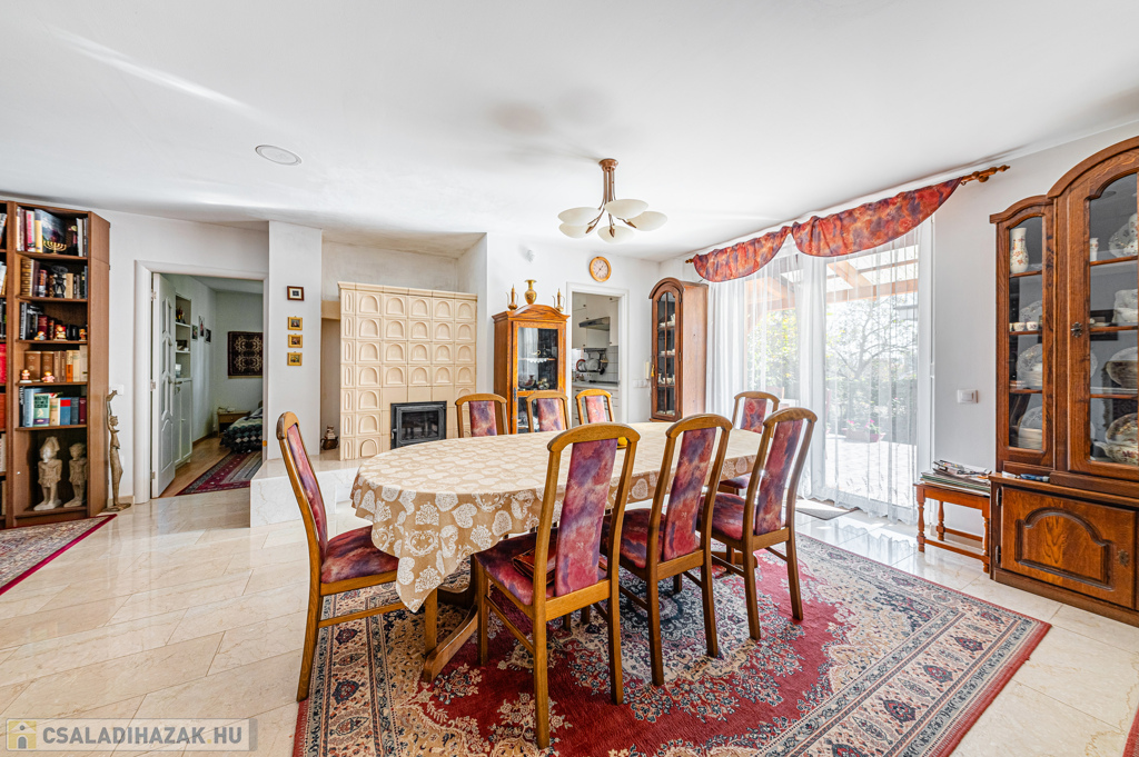 A földszinten tágas, óriási teraszhoz kapcsolódó nappali és étkező-konyha adja a központi életteret, amelyet a három helyiséghez is kapcsolódó, gyönyörű kerámia elemekkel épített cserépkályha tesz különlegessé.