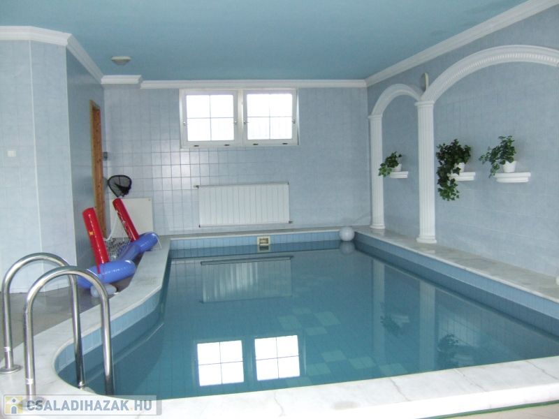 Az alsó szinten a dupla garázs mellett kondiszoba, szauna, zuhanyzó és ellenáramoltatóval felszerelt belső úszómedence van közvetlen kijárattal a fedett teraszra és onnan a kertbe.