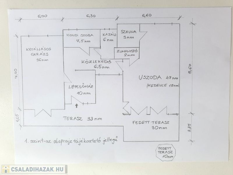 * kertszint 118+terasz: 63 m2: Dupla garázs, kondiszoba, uszoda 6,5x3,2 medencével, zuhanyzó, szauna, háztartási helyiség-kazánház, nagy terasz